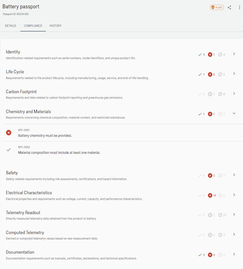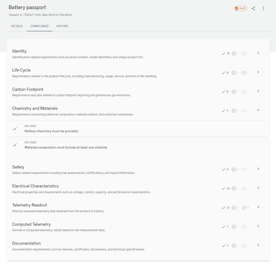Built-in EU Battery Regulation rules automatically verify and validate battery passport data, so every battery is always audit-ready.